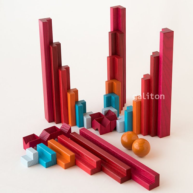 この《Tigno》は断面がL型のシンプルな形状で、同じ色と長さのパーツが4個(ステンダーは8個)あることから、点対称の構造も作りやすくなっています。また、ステンダーの上にVの字になるようにパーツを置いて勾配をつけると、ボールが転がる道を作れます。