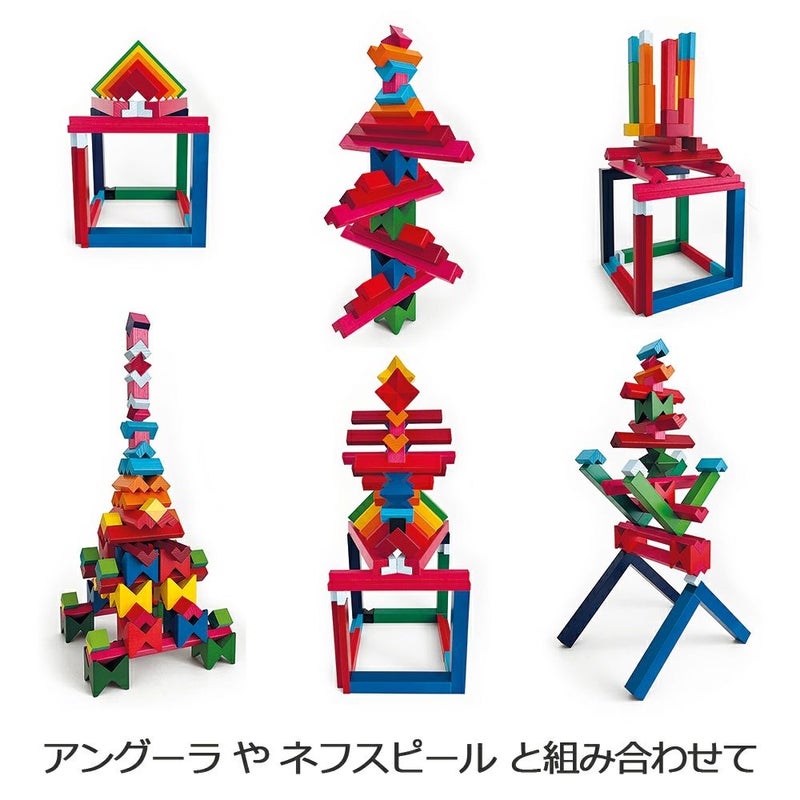 基尺は2.5cmなので、他のネフ社の積木とも相性よく遊べます。最長パーツはアングーラの最長パーツと同じ長さで、画像のようにアングーラやネフスピールなどと組み合わせると、遊びが広がりやすいでしょう。
