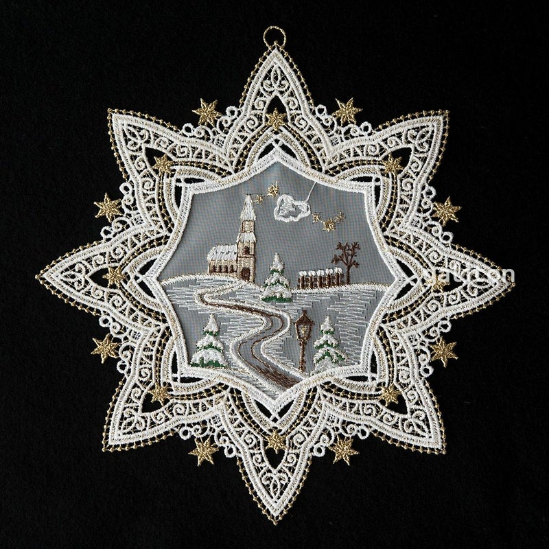 張りのあるレースでできたクリスマスオーナメントです。刺繍やレースの産地として世界的に有名なドイツ・プラウエンの街で作られています。