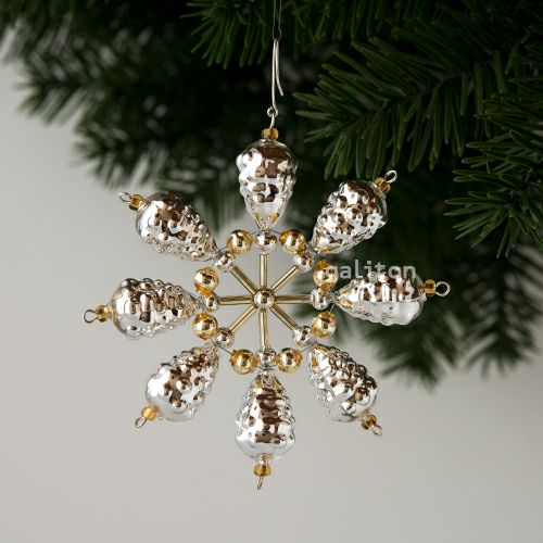 ガラス製のオーナメントです。伝統的な型吹きガラスの製法で作られた非常に薄くて軽いビーズが使用されています。チェコ製。