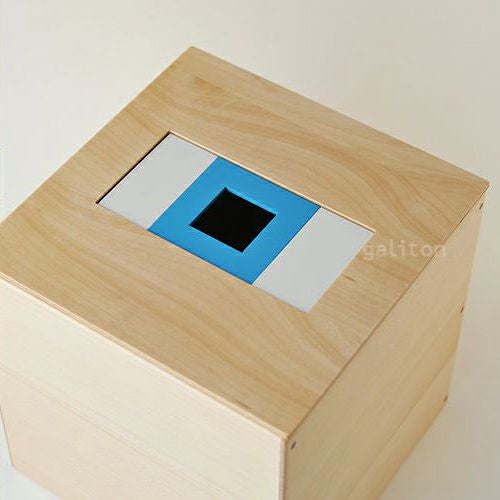 と同じもの)の上面に、中央に穴が開いたフタをのせて、そこにプレートをはめて形の合う積木を落とし込んでいきます。またプレートのみを使って積木やケルンモザイクをはめて遊ぶこともできます。